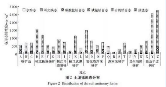 銻的金屬性不強,易形成銻的衍生物(銻化物、氫化物、有機銻化物等),其毒性的大小不僅與其總量有關,很大程度上還取決于其存在形態。其中單質銻的毒性高于其鹽類,無機銻的毒性高于有機銻,+3 價的毒性高于+5 價(+3 價的毒性大約是+5 價的10 倍),且同等價態銻的毒性還與其化合物的形態以及晶體結構有關。銻在土壤中主要以殘渣態的形式存在,占總銻的比例最高可達90%,水溶態含量最低。