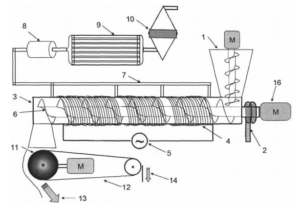 本土壤熱解吸設備以電磁加熱方式將受有機物污染的土壤加熱至有機物沸點以上。主要由土壤預處理系統、電磁熱解吸系統、尾氣處理系統組成。本發明所述熱解吸單元,其特征是通過電磁作用使得攪拌裝置產生渦流,用以加熱待處理的物質,將物質中有機污染物揮發成氣態后分離 ;磁分離熱解吸不但在一些溫度達到要求的情況下,用于分離汞和類金屬砷,而且在加入鐵粉原位吸附并磁分離后,可以吸附處理土壤中的金屬污染物。